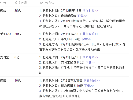 微博陌陌等的支持金額暫時(shí)無(wú)法確切的查證,但是只支付寶上,有1.56億的現(xiàn)金紅包和4.3億的購(gòu)物紅包。微博一共有十億。
