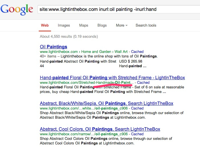 這個組合在inurl前增加了一個負號 – 他的意思也很容易理解,就是去除某關鍵詞的意思,我們看上面的搜索截圖中,在oil-painting前面有hand這個單詞,那么如果我們不希望搜索結果中出現(xiàn)hand,則可以使用 -inurl: hand ,我們來把site: inurl: -inurl: 這三個組合一起使用,來看看效果。(如果你不想handmade也出現(xiàn),那么還需要增加這個單詞)
