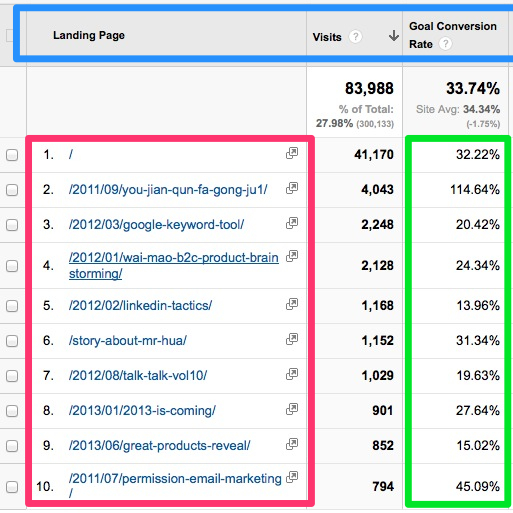 還有一種情況,我們可以通過Google Analytics里的比較功能,來把兩個維度結(jié)合起來比較,比如說我們把直接流量的登陸頁地址和實際詢盤獲取的比例結(jié)合起來分析,如下圖,藍(lán)色代表了三種維度,依次是:直接流量登陸頁,訪問次數(shù),轉(zhuǎn)換比例。 紅色框子內(nèi)就是具體的直接流量登陸頁的地址URL, 綠色則是具體的轉(zhuǎn)換率數(shù)字。從這些數(shù)字你可以看到哪個頁面轉(zhuǎn)換率最高,哪些頁面轉(zhuǎn)換率低,對于轉(zhuǎn)換率高的頁面我們可以盡量增加他的曝光度或者增加推廣力度,而對于轉(zhuǎn)換率低的則很明顯我們需要去做網(wǎng)站的用戶體驗調(diào)整了。