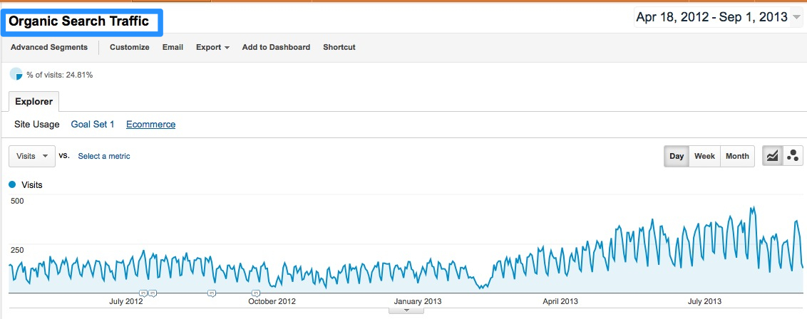 搜索流量(Search Traffic) 是指通過搜索引擎獲取的流量,這包括了付費和免費的流量,掌握搜索流量的數(shù)據(jù)也是至關(guān)重要的,這些數(shù)據(jù)可以幫助你知道你所做的SEO效果如何,哪些地方可以加強,哪些地方是無用功,首先在Google Analytics工具中,我們可以看到我們網(wǎng)站的搜索流量在過去特定時間內(nèi)的變化 (下圖為米課從2012年4月到2013年8月的搜索流量變化)通過這個數(shù)據(jù)你可以大概知道你的網(wǎng)站的健康情況,當(dāng)然這還只是一個Overview大體的數(shù)據(jù),不過從中你也可以發(fā)現(xiàn)很多細(xì)節(jié)。比如某個時間段流量降低了,我們就可以就這個特定的時間段做更深的分析。