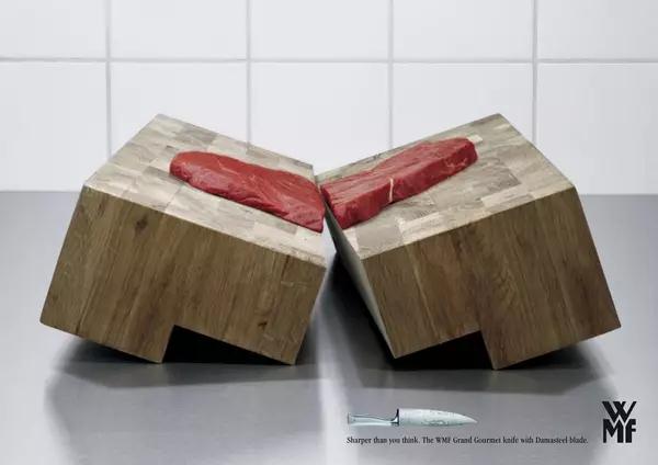 從上個分析中我們得到創(chuàng)意就是給人意想不到的效果,給人驚喜,而在廣告的運用中,創(chuàng)意更是最核心的部分,如Scotch運用非常簡單的畫面,貼上膠帶,就算把堅硬的圖釘掰彎了都撕不下了,來比喻他們的產(chǎn)品質(zhì)量超群,而wmf也是運用的相同的手法,一把小刀太過鋒利導致把整張桌子都切成兩半,也是用非??鋸埖氖址▉韽娬{(diào)他們產(chǎn)品的功能性,打破了固有的思維方式,給了消費者意想不到的結(jié)果,所以創(chuàng)意應(yīng)該是,情理之中卻是意料之外的。