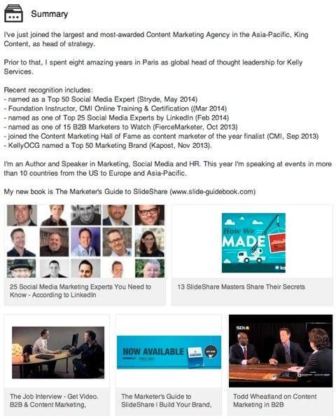 Todds用新書(shū)封面、PPT幻燈片、文章鏈接、個(gè)人演講視頻這些視覺(jué)元素美化自己的個(gè)人資料,看起來(lái)富有創(chuàng)造力,很容易獲得好的第一印象。視覺(jué)內(nèi)容最好保持定期更新,展現(xiàn)自己的一種積極態(tài)度,一來(lái)是獲得更好的視覺(jué)元素,另一方面也避免了給人留下一種做作的感覺(jué)。特別是一些獲獎(jiǎng)或者表彰類的視覺(jué)性資料,能讓你的資料更充實(shí),個(gè)人形象更生動(dòng)。