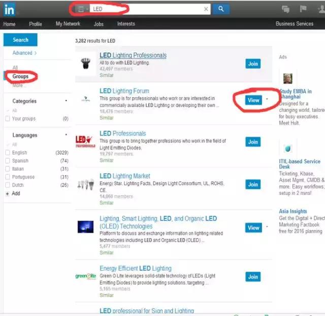 我們登陸頁面后,可以通過產(chǎn)品進行搜索,會搜索出來很多我們想要的結(jié)果,然后選擇GROUPS,我們會看到有view和join這兩個詞。一般選擇view的先進去,其次點擊join加入,然后就是耐心的等待審核。我以LED為例給大家示范下: