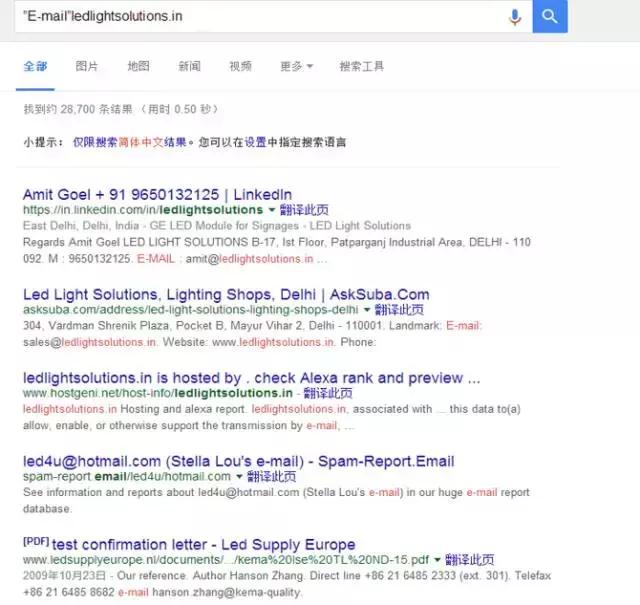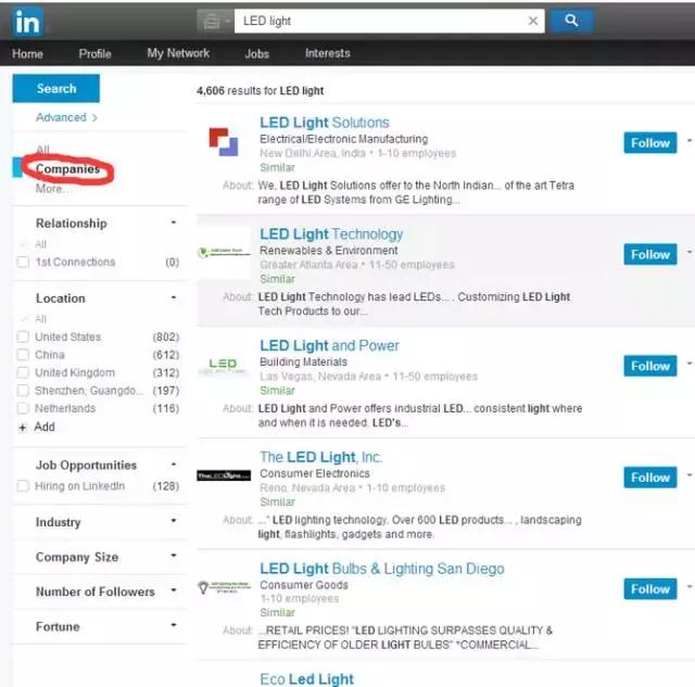 分享完如何用LinkedIn 中的GROUPS結(jié)合谷歌找客戶之后,下面就來分享companies結(jié)合谷歌找客戶,我以LED light為例。輸入LED light后會出現(xiàn)很多我們想要的東西,我隨便寫一個進去,進入網(wǎng)站后經(jīng)過了解發(fā)現(xiàn)是我們的目標客戶,但是網(wǎng)上沒有客戶的郵箱,這時可以聯(lián)合Google進行查找。如下圖所示: