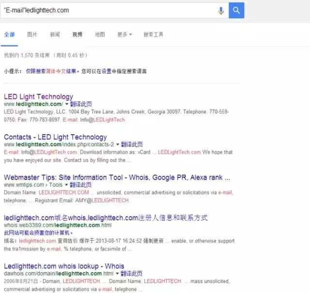 當我們再看另一個客戶的頁面時,看到了他留的公司信息,但打開后發(fā)現(xiàn),他們網(wǎng)站上也是沒有留郵箱。但是沒有關(guān)系,只要熟悉google搜索方法,通常郵箱都可以挖出來。這次是使用郵箱+客戶名字+域名,示范如下”E-mail” Rob Huston ledcanada.com。
