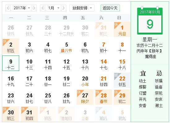 2017.1.26-2.2,其中1.21、1.22、2.4調(diào)休,早8點(diǎn)正常上班。