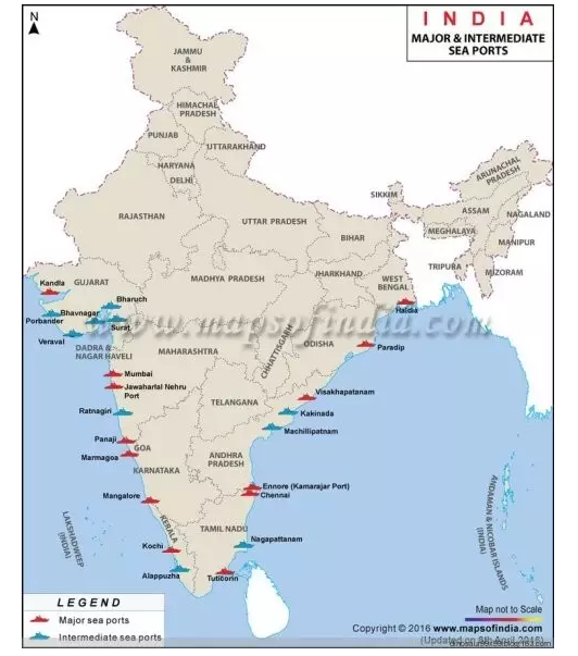根據Map of India網站(www.mapsofindia.com)介紹,印度主要的港口有12個,但以下歸成了11個。如圖所示,自西向東分別如下: