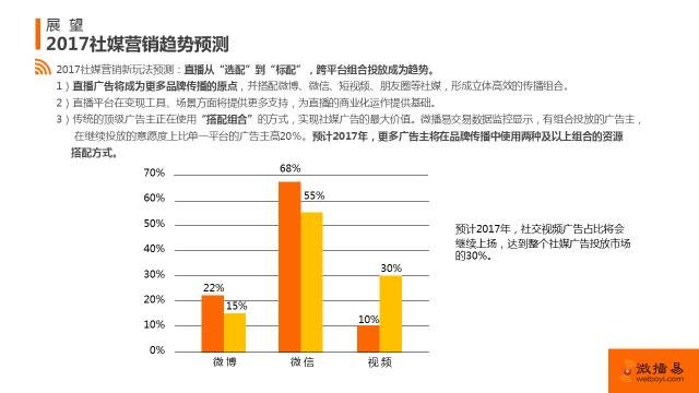 ◣ 2016年社交視頻(含短視頻和直播)異軍突起,實(shí)際投放占比社媒傳播高達(dá)10%,預(yù)估2017年這一數(shù)字可達(dá)到30%;