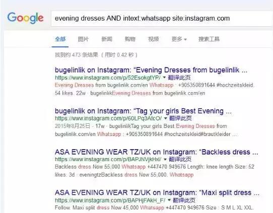 比方我們的關(guān)鍵詞有evening dresses, wedding dresses,evening gowns等。在谷歌中搜索evening dresses AND intext:whatsapp site:instagram.com,結(jié)果如下圖所示: