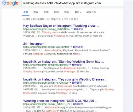 現(xiàn)在再換換個(gè)關(guān)鍵詞,搜wedding dresses AND intext:whatsapp site:instagram.com,如果如下圖所示: