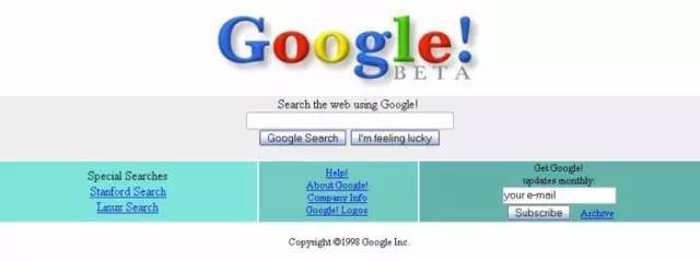 Google1998年的頁面,標(biāo)識后面也有個驚嘆號,可能在模仿Yahoo!