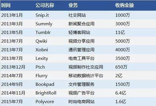 2012年,“硅谷女神”瑪麗莎·梅耶爾出任雅虎CEO,先后收購了50多家公司,涉及社交網(wǎng)站、輕博客、視頻、游戲、電話會議系統(tǒng)等領(lǐng)域。