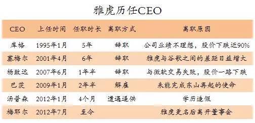 更加奇葩的是,雅虎22年換了7任CEO,最長的任期6年,短的僅4個月就被董事會趕下臺。