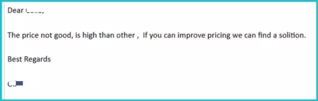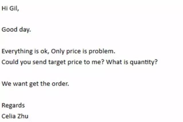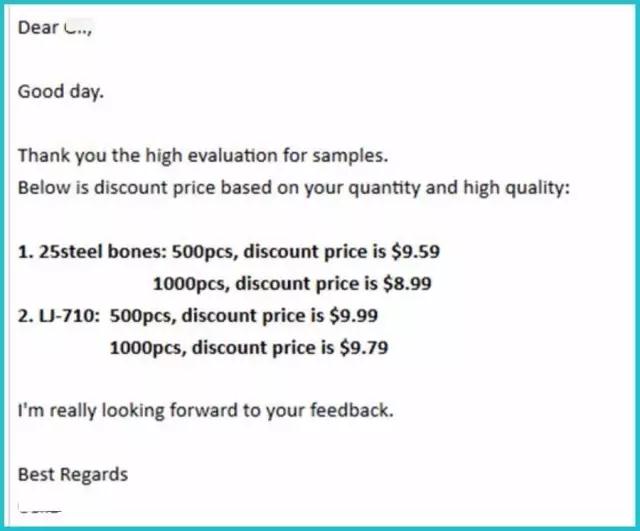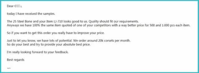 在這封郵件里,可以看到客戶對(duì)于樣品的質(zhì)量很滿意,但客戶很精明,說他們有收到其他供應(yīng)商更好的價(jià)格,同時(shí)還拋出了他每月的預(yù)訂數(shù)量,給買方畫了一個(gè)大餅。
